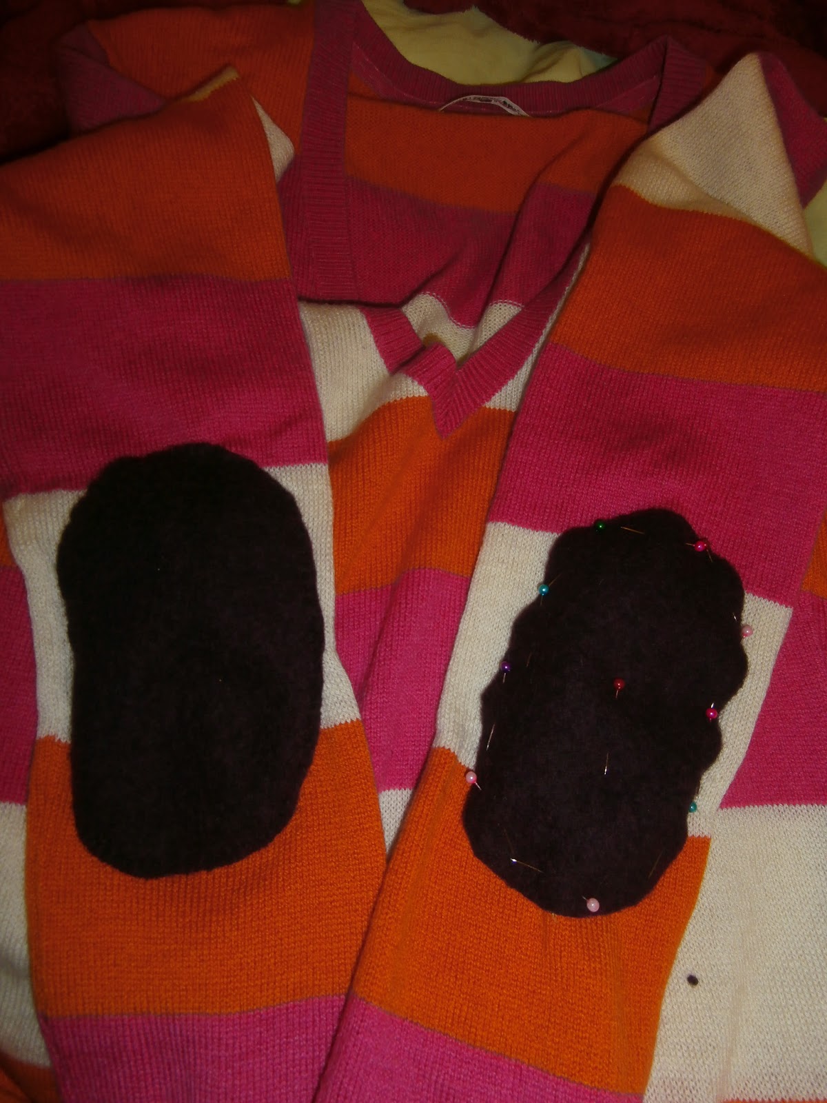 My flatmate had this sweater since forever I guess, though you could never tell, and she was about to trash it because both of the sleeves were torn under the elbows. Fortunately I stopped her on time, borrowed it for a couple of hours and gave it back refashioned and ready to wear, with the elbow patches on.